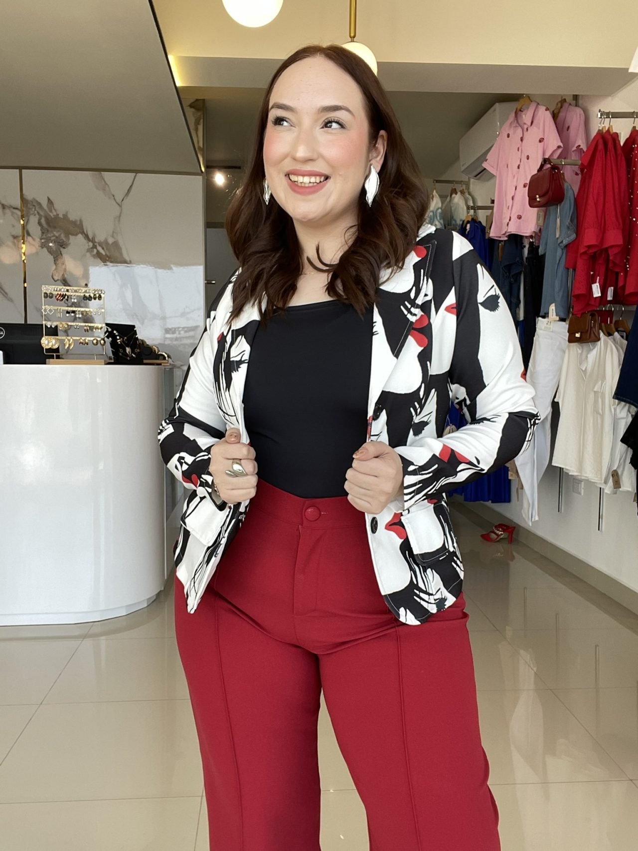 Eleva cualquier conjunto con nuestro llamativo blazer estampado, una pieza clave que combina elegancia con un toque artístico. Presenta un diseño abstracto en tonos contrastantes de blanco, negro y rojo, creando un patrón dinámico y moderno. Confeccionado con un corte clásico que se adapta a la figura, este blazer es perfecto para añadir sofisticación y personalidad a looks casuales o para completar un atuendo de oficina con un giro audaz. Sus solapas y cuello definidos le dan un aire formal, mientras que el estampado lo mantiene fresco y contemporáneo.