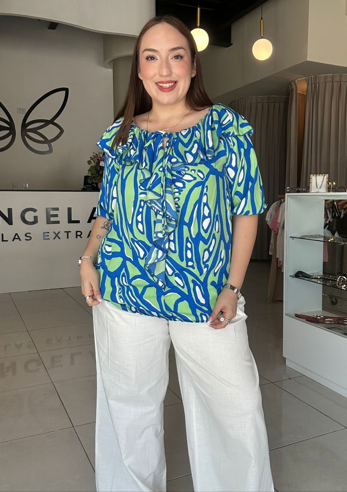 Atrévete a destacar con nuestra blusa de vibrante estampado tropical en tonos de azul y verde, con pinceladas blancas. Su escote elástico con volantes te permite usarla de manera versátil, ya sea en un hombro, ambos o con escote barco. El detalle de lazo ajustable en el centro añade un toque coqueto, mientras que las mangas cortas y holgadas aseguran máxima comodidad. ¡Perfecta para inyectar frescura y alegría a tus días de verano!
