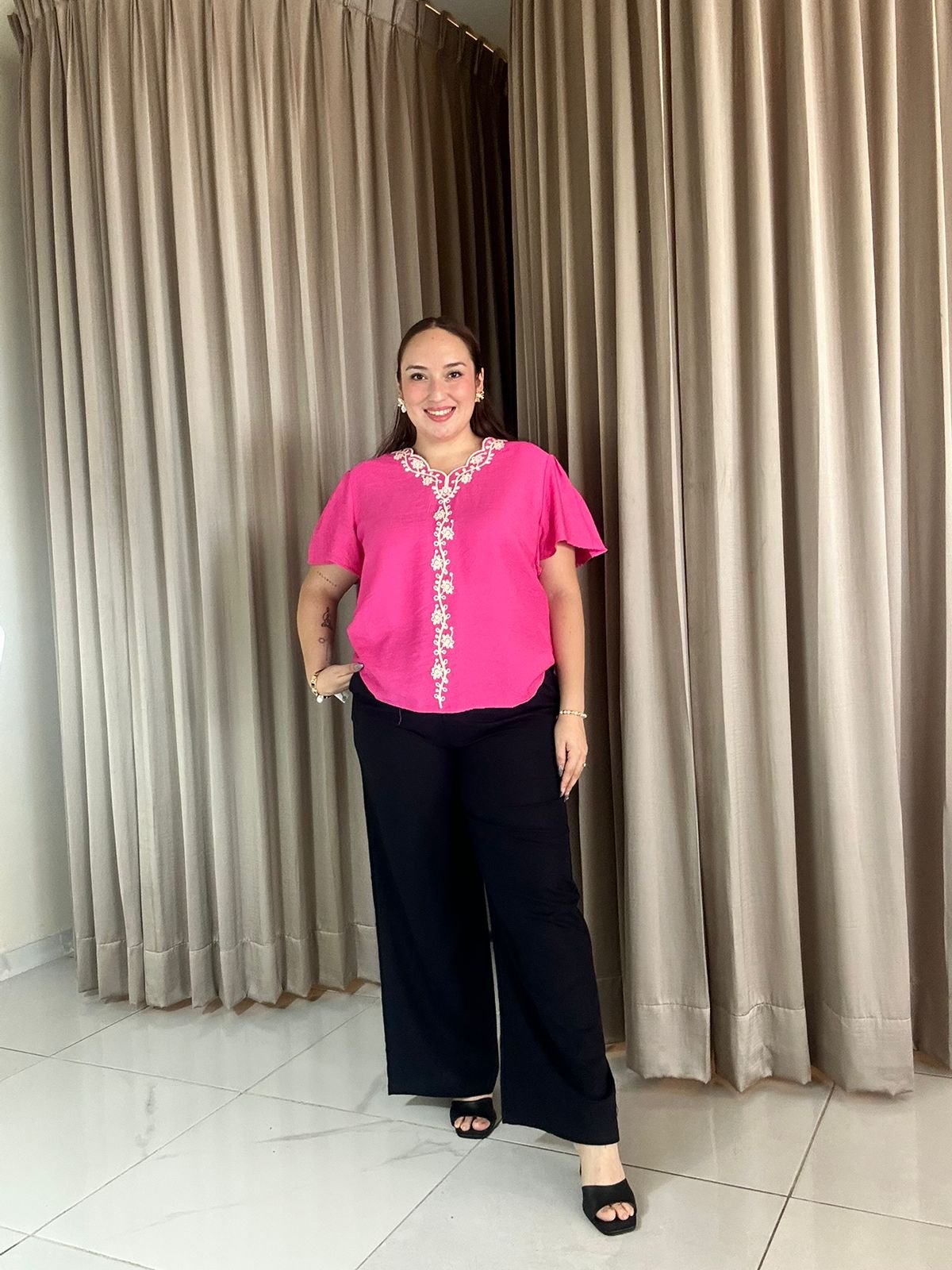 Agrega un toque vibrante y femenino a tu look con esta blusa en tono fucsia, decorada con delicado bordado frontal en contraste que resalta su diseño artesanal. Su corte suelto y mangas cortas tipo mariposa brindan frescura y comodidad, ideal para cualquier temporada. Combínala con pantalones de vestir, mezclilla o faldas para un estilo versátil y sofisticado.