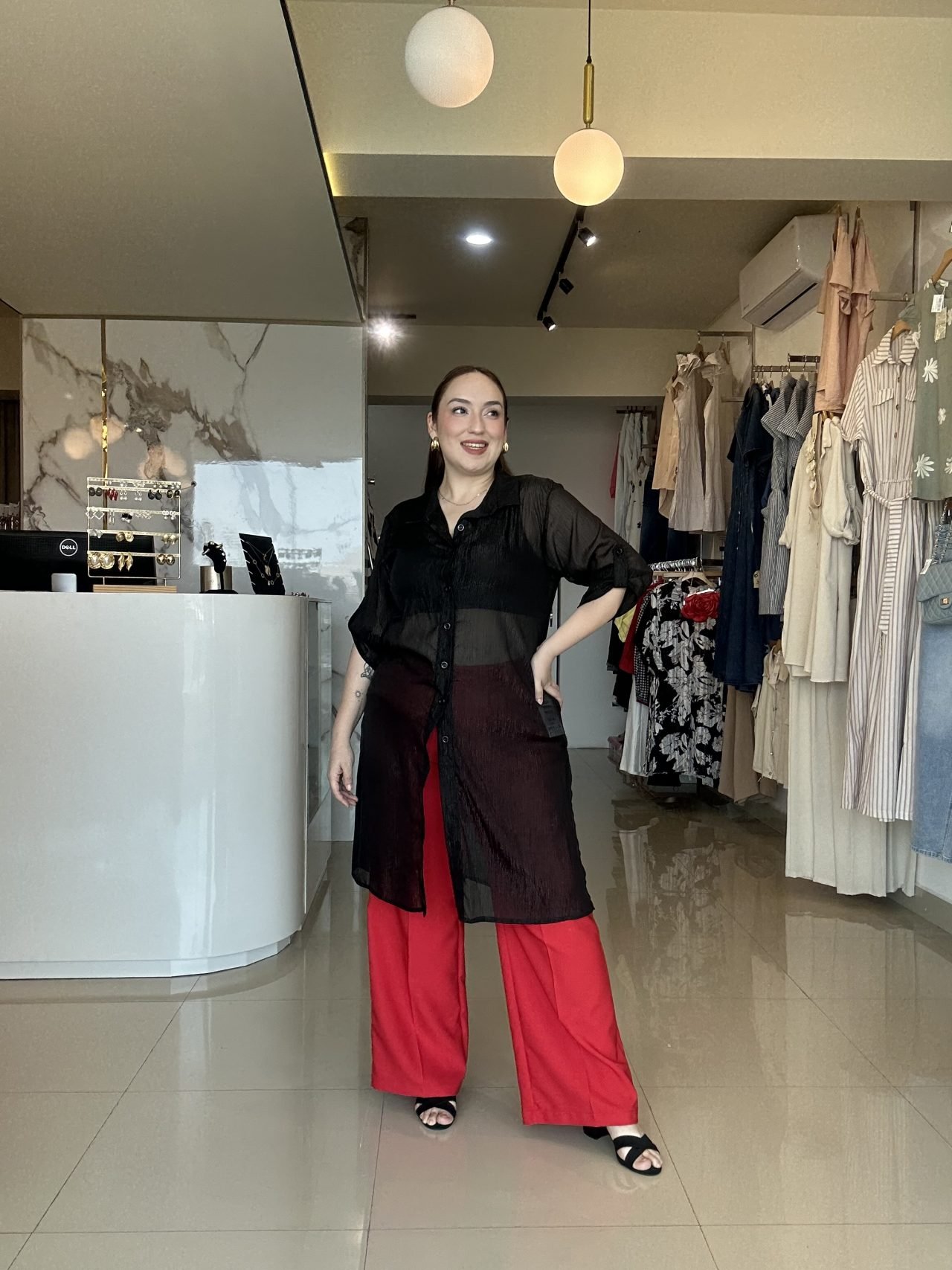 Este blusón en tono negro deslumbra con sutiles brillos que capturan la luz con cada movimiento. Su tela ligeramente transparente aporta un toque sofisticado y sugerente sin perder la elegancia. De largo hasta la rodilla, es ideal para usar con leggings, pantalones ajustados o incluso como salida de playa con estilo. Una prenda versátil que eleva cualquier look con un aire glamuroso y moderno.