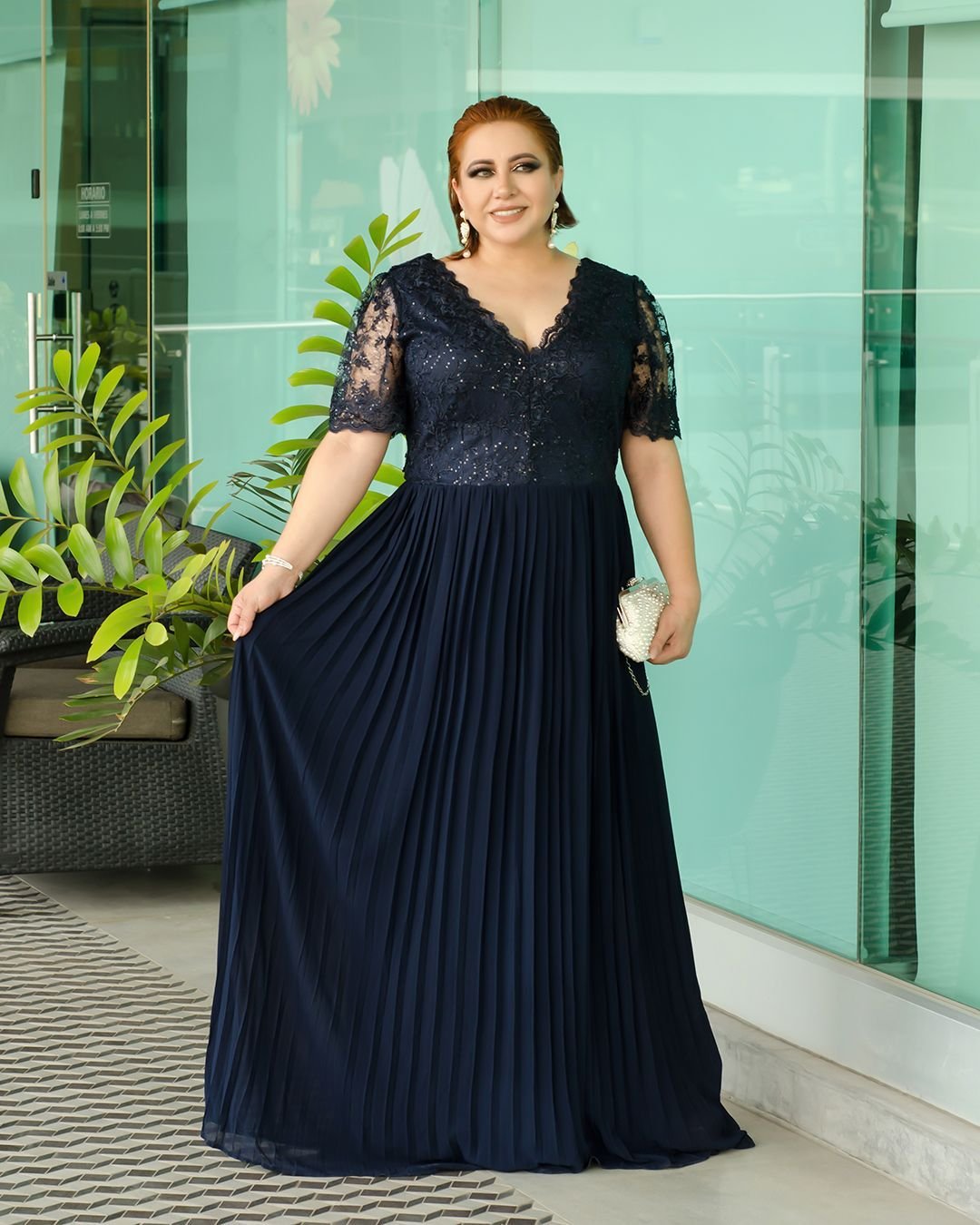 Deslumbra en cualquier evento formal con nuestro espectacular vestido largo en un profundo tono azul marino. La parte superior presenta un diseño exquisito con un delicado encaje floral que cubre el escote en V y las mangas cortas, añadiendo un toque de romanticismo y glamour. La falda, de corte largo y fluido, está confeccionada con un elegante plisado que le otorga un movimiento excepcional y una silueta grácil con cada paso. ¡Ideal para bodas de noche, galas o cualquier celebración donde quieras lucir impecable y deslumbrante!