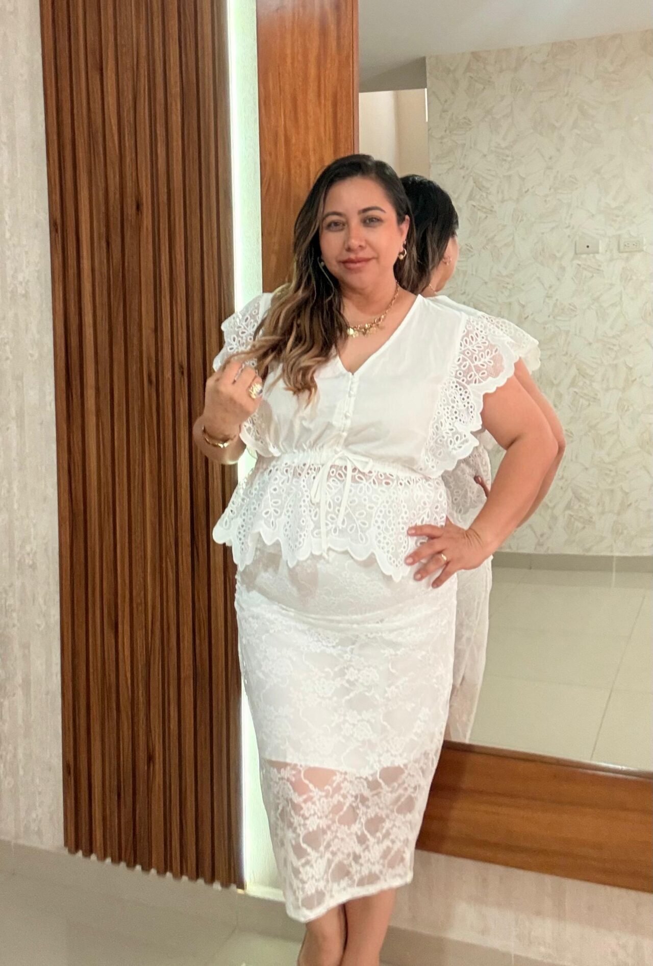 Falda femenina y sofisticada confeccionada en encaje delicado con diseño floral, ideal para crear looks románticos y modernos. Su corte recto tipo lápiz estiliza la silueta resaltando las curvas de forma elegante, mientras que el detalle de fruncido lateral ayuda a moldear visualmente la figura y brindar mayor comodidad al caminar.