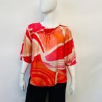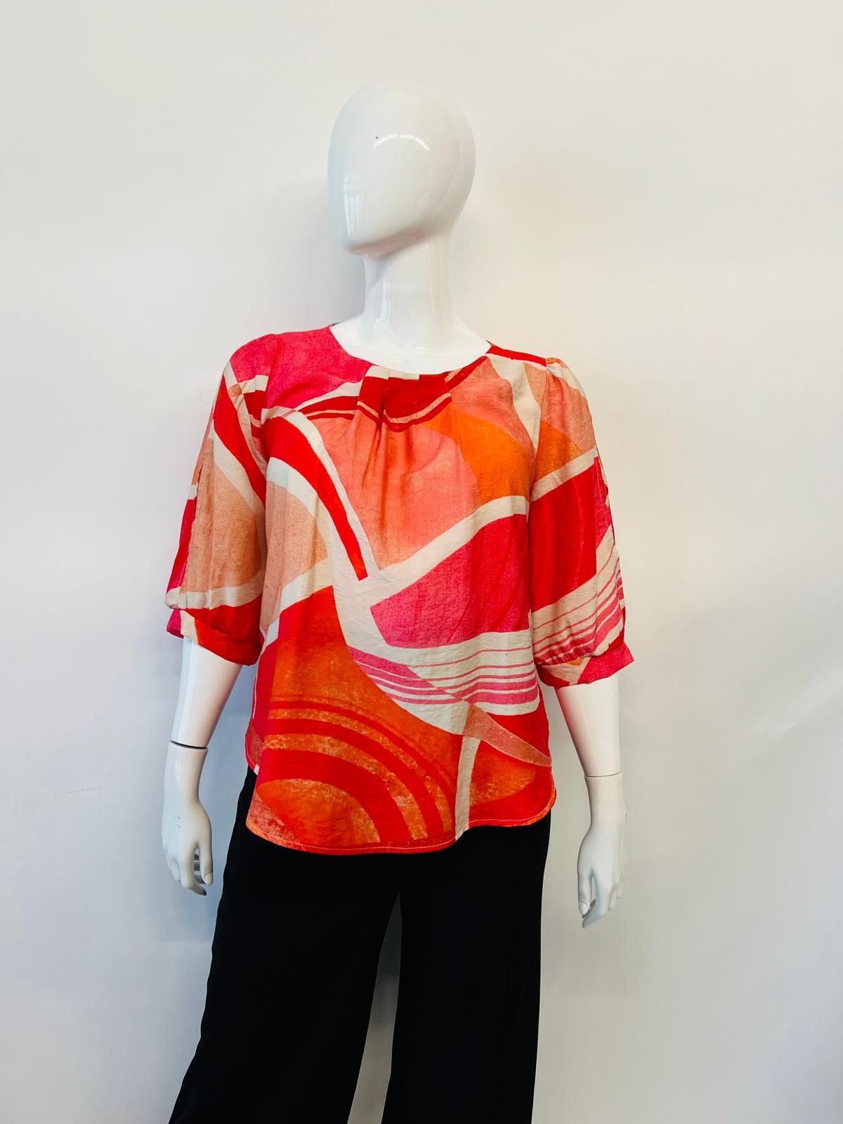 Inyecta vitalidad a tu guardarropa con nuestra blusa de estampado geométrico en una vibrante paleta de rojos, naranjas y rosas. Su diseño de cuello redondo fruncido y mangas 3/4 holgadas ofrece una caída fluida y un estilo cómodo. El patrón dinámico crea un efecto visual moderno y audaz, perfecto para destacar. ¡Ideal para un look casual-chic que irradie energía y personalidad!
