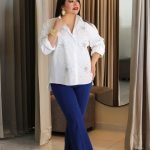 Pantalón cómodo y estilizado, con elástico en la cintura que se adapta perfectamente a tu figura sin apretar. Confeccionado en tela stretch, ofrece libertad de movimiento y una caída fluida que estiliza. Su diseño acampanado alarga visualmente las piernas y añade un toque moderno y favorecedor. Ideal para combinar tanto con blusas formales como con prendas casuales, este pantalón es una prenda clave para looks cómodos y con estilo.