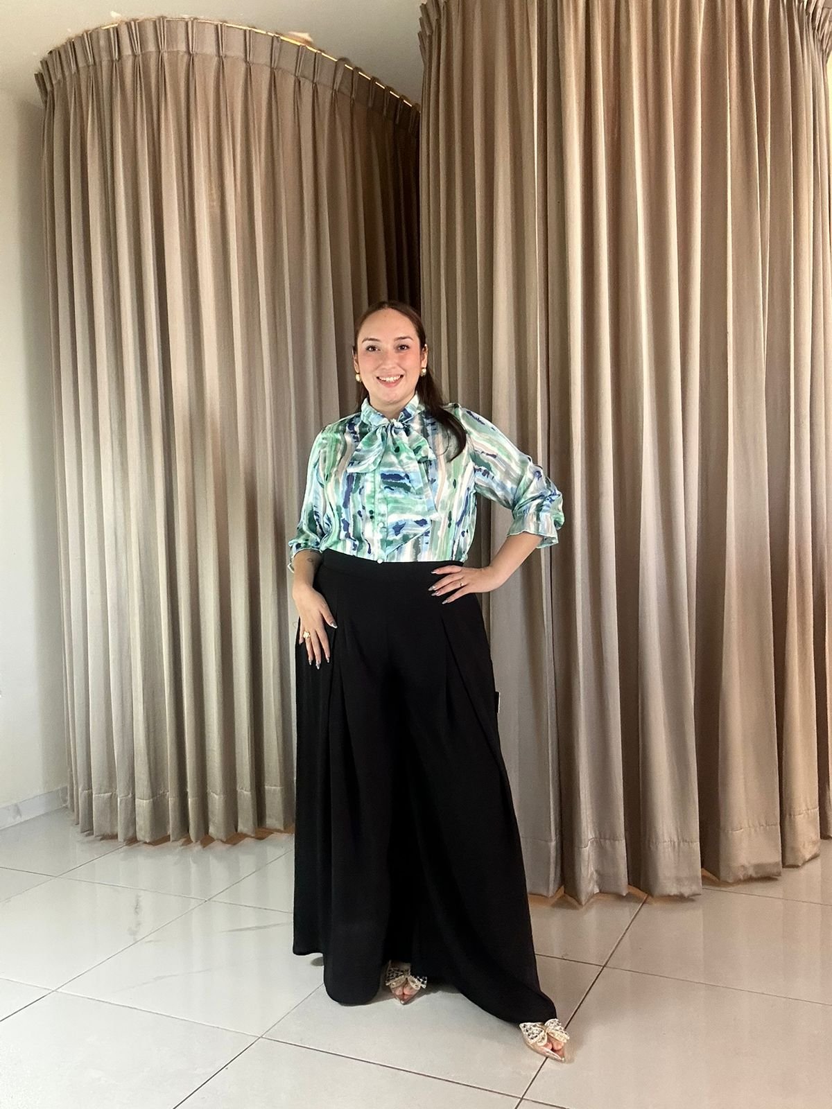 Eleva tu estilo con nuestro pantalón palazzo de vestir en color negro, diseñado para ofrecer elegancia y comodidad en cada movimiento. Su corte amplio y fluido estiliza la figura, mientras que su tela ligera permite un ajuste cómodo durante todo el día. Ideal para combinar con blusas estampadas, camisas formales o tops elegantes para crear looks sofisticados para la oficina, reuniones o eventos especiales.