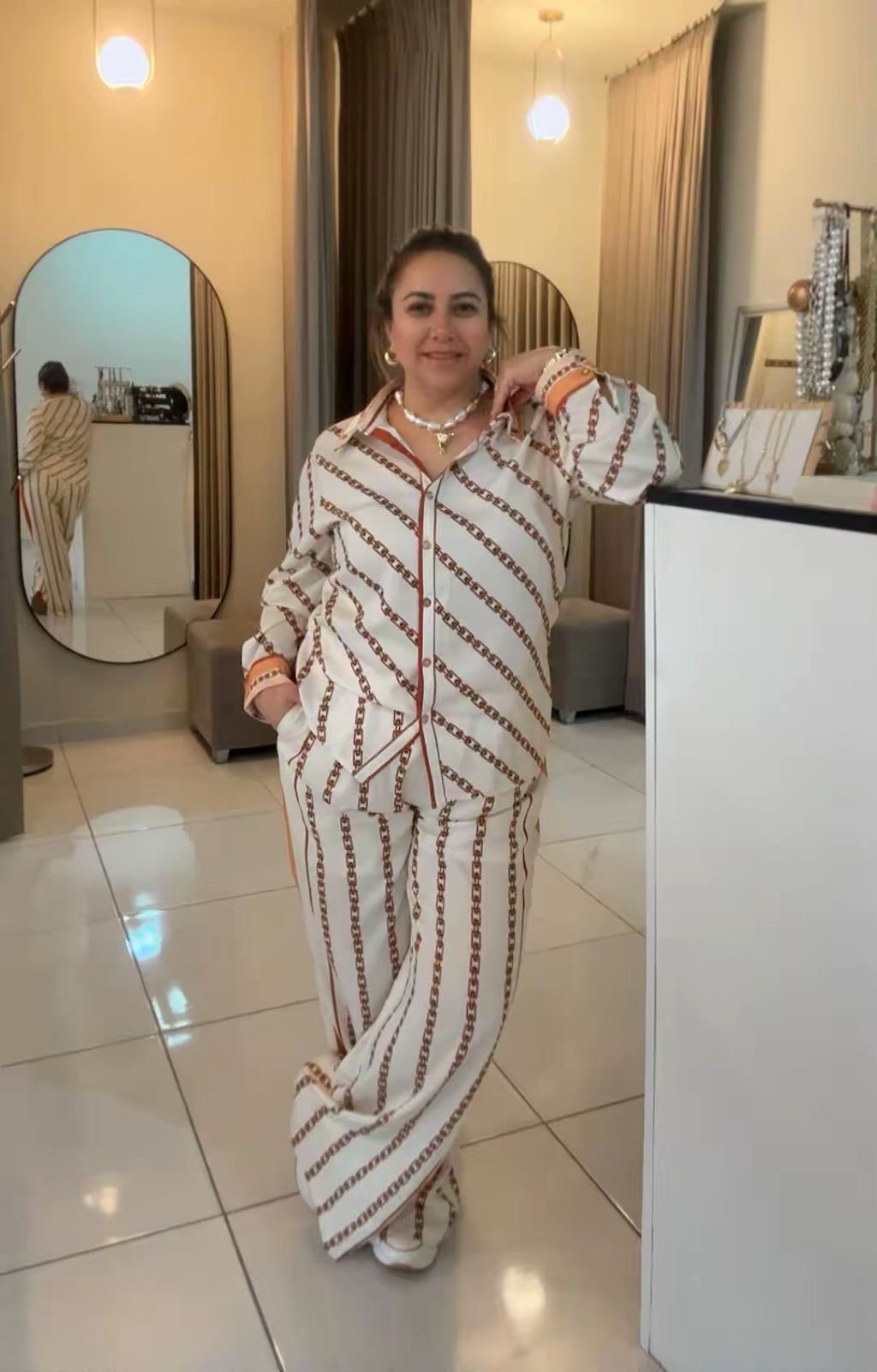 Conjunto de dos piezas que combina estilo y comodidad en un diseño moderno y sofisticado. Incluye camisa de manga larga con botones frontales y pantalón de corte amplio, ambos con un elegante estampado de cadenas que aporta un toque distintivo y actual.
