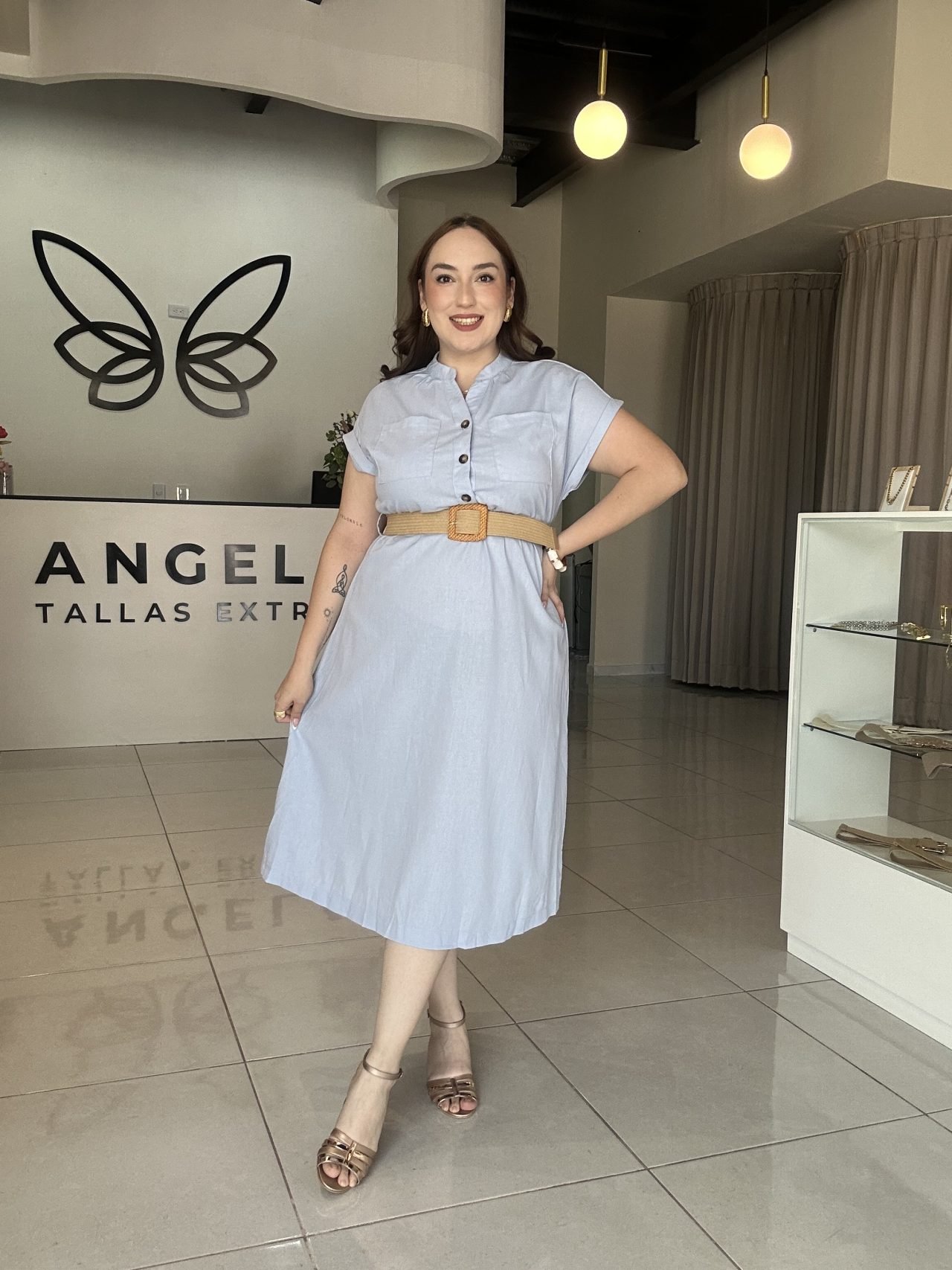 Las mangas cortas y holgadas añaden un toque casual y fresco, mientras que los bolsillos tipo parche en el pecho aportan funcionalidad y un detalle distintivo. Se completa con un cinto trenzado de estilo bohemio que define la cintura, creando una silueta favorecedora y relajada.