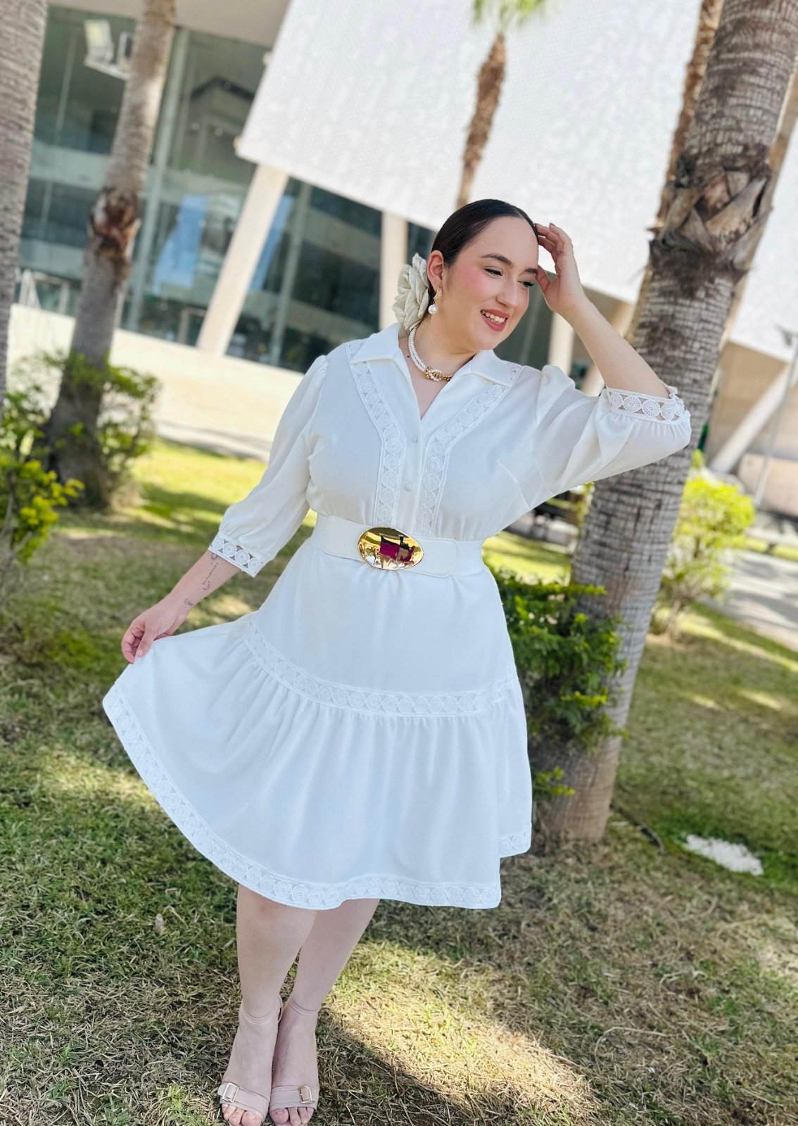 Este encantador vestido blanco corto es la personificación de la elegancia y la frescura. Confeccionado en un tejido ligero, presenta un cuello camisero con detalles de encaje calado en la parte superior del cuerpo y las mangas. Las mangas 3/4 ligeramente abullonadas y con puños de encaje añaden un toque romántico. La cintura se define con un cinturón ancho en tono claro con una hebilla dorada ornamentada, dando paso a una falda con volantes que termina con un delicado borde de encaje. Ideal para eventos de día, paseos veraniegos o un estilo casual chic.