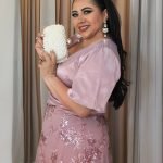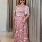Deslumbra con nuestro encantador vestido de fiesta, diseñado en una sofisticada tela malva con un delicado brillo. Presenta un favorecedor escote en V cruzado y mangas cortas estilo mariposa, que fluyen con gracia. La parte superior simula un top envolvente, integrándose armoniosamente con la falda larga, bellamente adornada con intrincados bordados florales y lentejuelas que capturan la luz con cada movimiento. Este diseño de una sola pieza realza la silueta con elegancia y fluidez, garantizando una presencia deslumbrante. Ideal para eventos especiales, bodas o cualquier celebración donde quieras lucir radiante y sofisticada.
