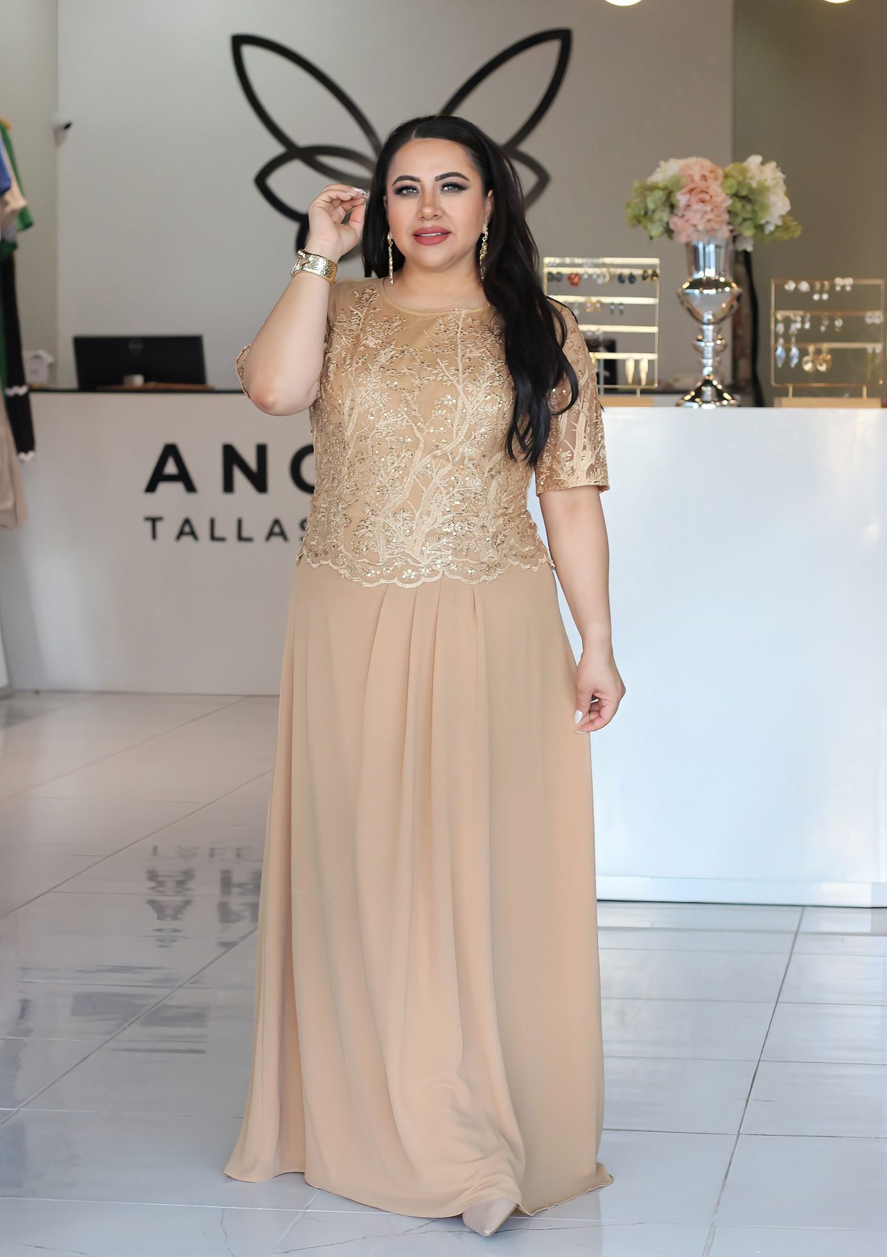 Irradia sofisticación con nuestro exquisito vestido de fiesta en un suave tono con detalles dorados, realzado por la delicadeza de su diseño. La parte superior, confeccionada en un encaje dorado intrincado, presenta mangas cortas y un elegante escote redondo que realza la feminidad. La cintura se define con un delicado fruncido, dando paso a una falda larga y fluida con un hermoso movimiento plisado. Su caída vaporosa y el forro interior aseguran un ajuste cómodo y una presencia impecable. Ideal para bodas, eventos formales o celebraciones donde quieras deslumbrar con un estilo clásico y distinguido.