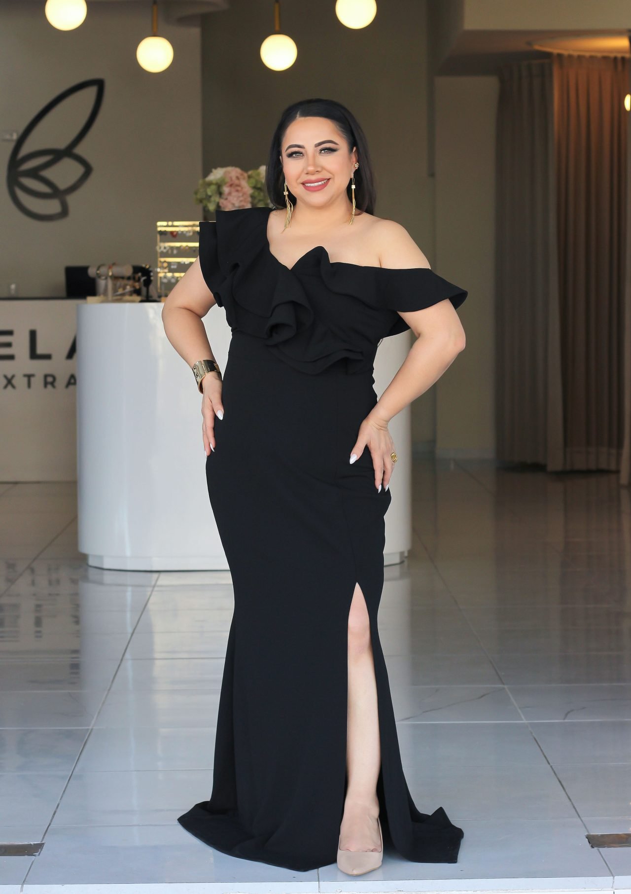 Impacta con nuestro espectacular vestido de noche en un clásico e intemporal color negro, diseñado para destacar. Este elegante modelo presenta un escote asimétrico que deja un hombro al descubierto, realzado por un volado drapeado que añade volumen y sofisticación. La silueta es ajustada al cuerpo, resaltando las curvas con gracia, y culmina en una falda larga tipo sirena que fluye elegantemente hasta el suelo. Una sensual abertura lateral en la pierna completa este diseño, añadiendo un toque de drama y movimiento. Perfecto para galas, eventos formales o cualquier ocasión donde quieras deslumbrar.