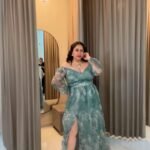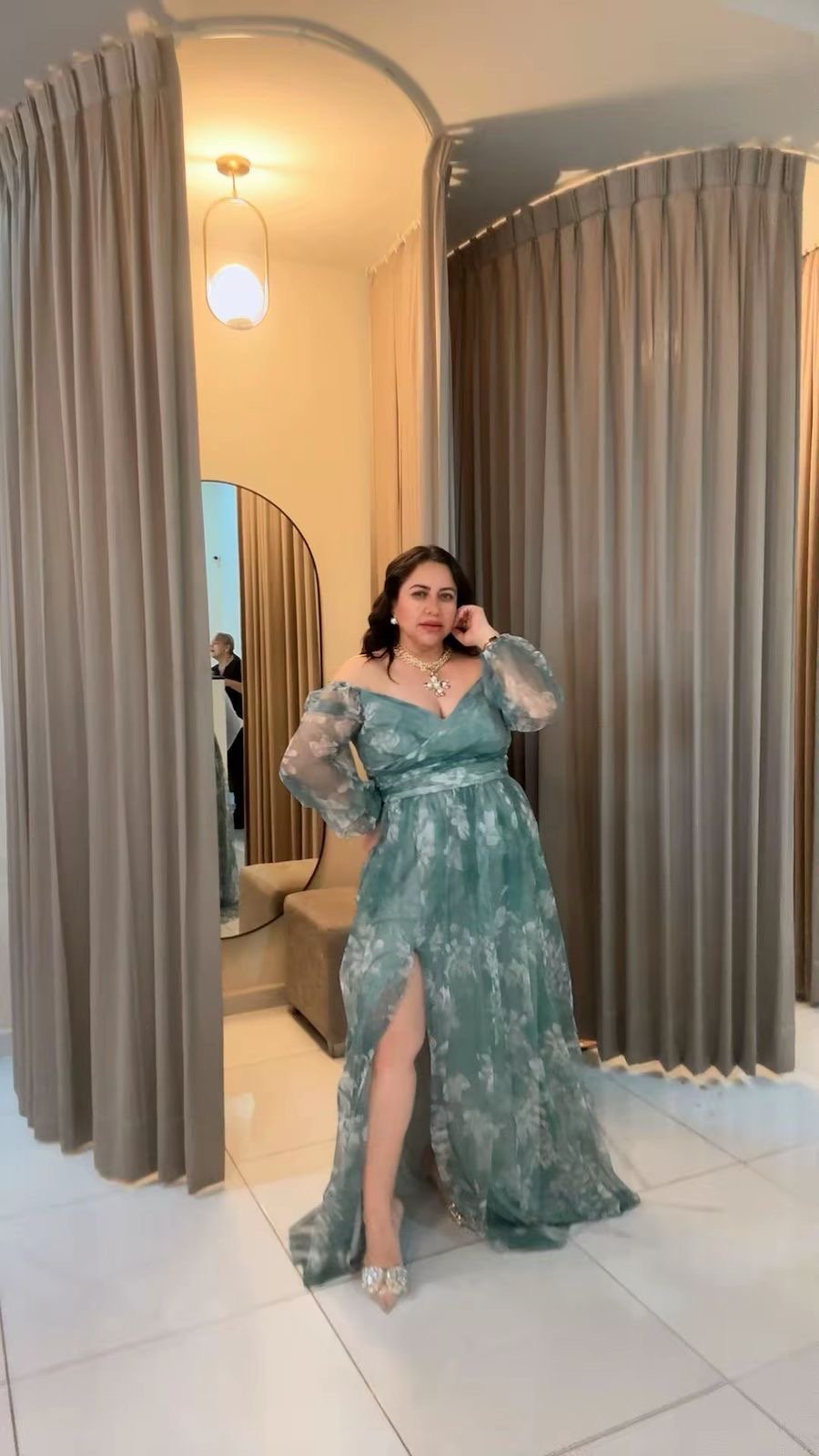 Las mangas largas en tela semi transparente añaden ligereza y movimiento, creando un efecto delicado y glamuroso. La cintura marcada estiliza la silueta curvy, mientras que la falda amplia con abertura lateral aporta sensualidad y permite caminar con comodidad y seguridad.