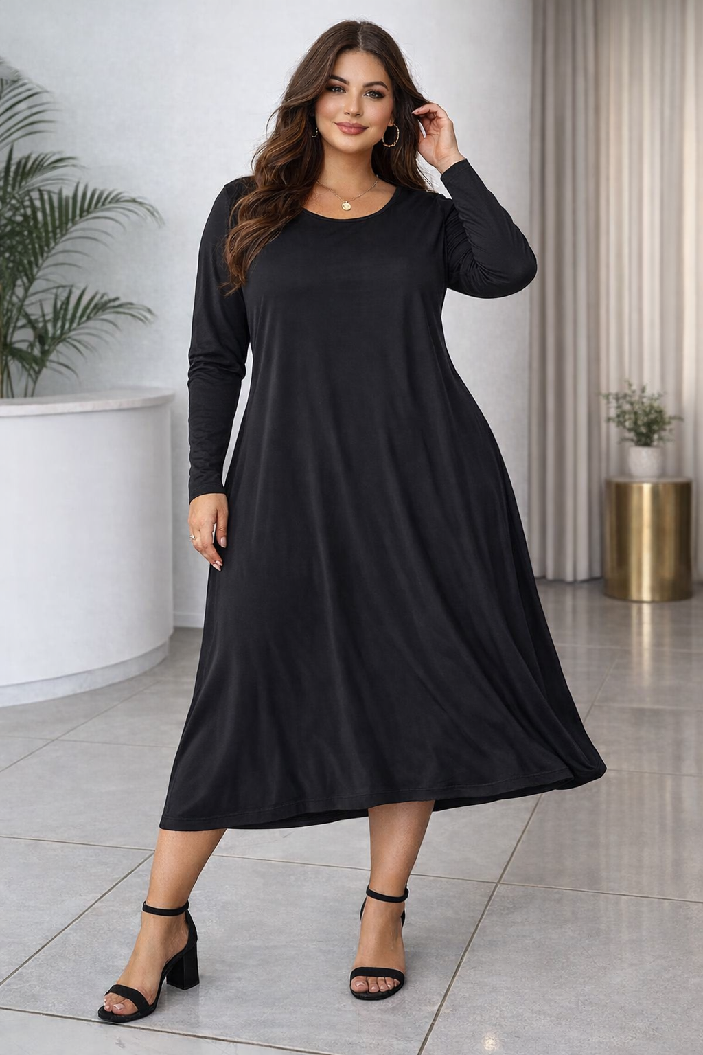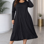 Vestido de diseño minimalista y sofisticado, confeccionado en tela suave y ligera que brinda comodidad absoluta y una caída fluida que acompaña el movimiento al caminar. Su escote redondo clásico y manga larga aportan equilibrio y elegancia, mientras que el corte amplio tipo A estiliza la figura sin marcar.