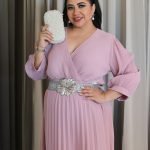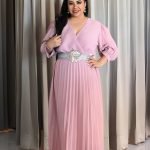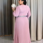 Envuélvete en la delicadeza y el movimiento con nuestro vestido largo plisado en un dulce tono rosado. El diseño presenta un favorecedor cuerpo cruzado con escote en V y mangas largas abullonadas que terminan en un puño ajustado, añadiendo un toque de romanticismo. La cintura se define elegantemente con un falso cinturón metálico adornado con una impresionante flor de pedrería, que captura la luz con cada paso. La falda, completamente plisada, crea una silueta fluida y etérea. Ideal para eventos formales, bodas de día o cualquier celebración que pida un estilo femenino y sofisticado.