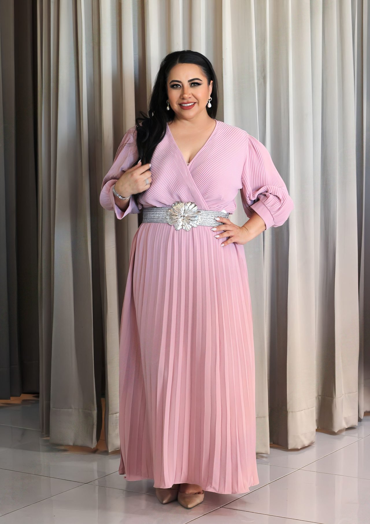 Envuélvete en la delicadeza y el movimiento con nuestro vestido largo plisado en un dulce tono rosado. El diseño presenta un favorecedor cuerpo cruzado con escote en V y mangas largas abullonadas que terminan en un puño ajustado, añadiendo un toque de romanticismo. La cintura se define elegantemente con un falso cinturón metálico adornado con una impresionante flor de pedrería, que captura la luz con cada paso. La falda, completamente plisada, crea una silueta fluida y etérea. Ideal para eventos formales, bodas de día o cualquier celebración que pida un estilo femenino y sofisticado.