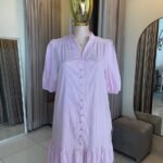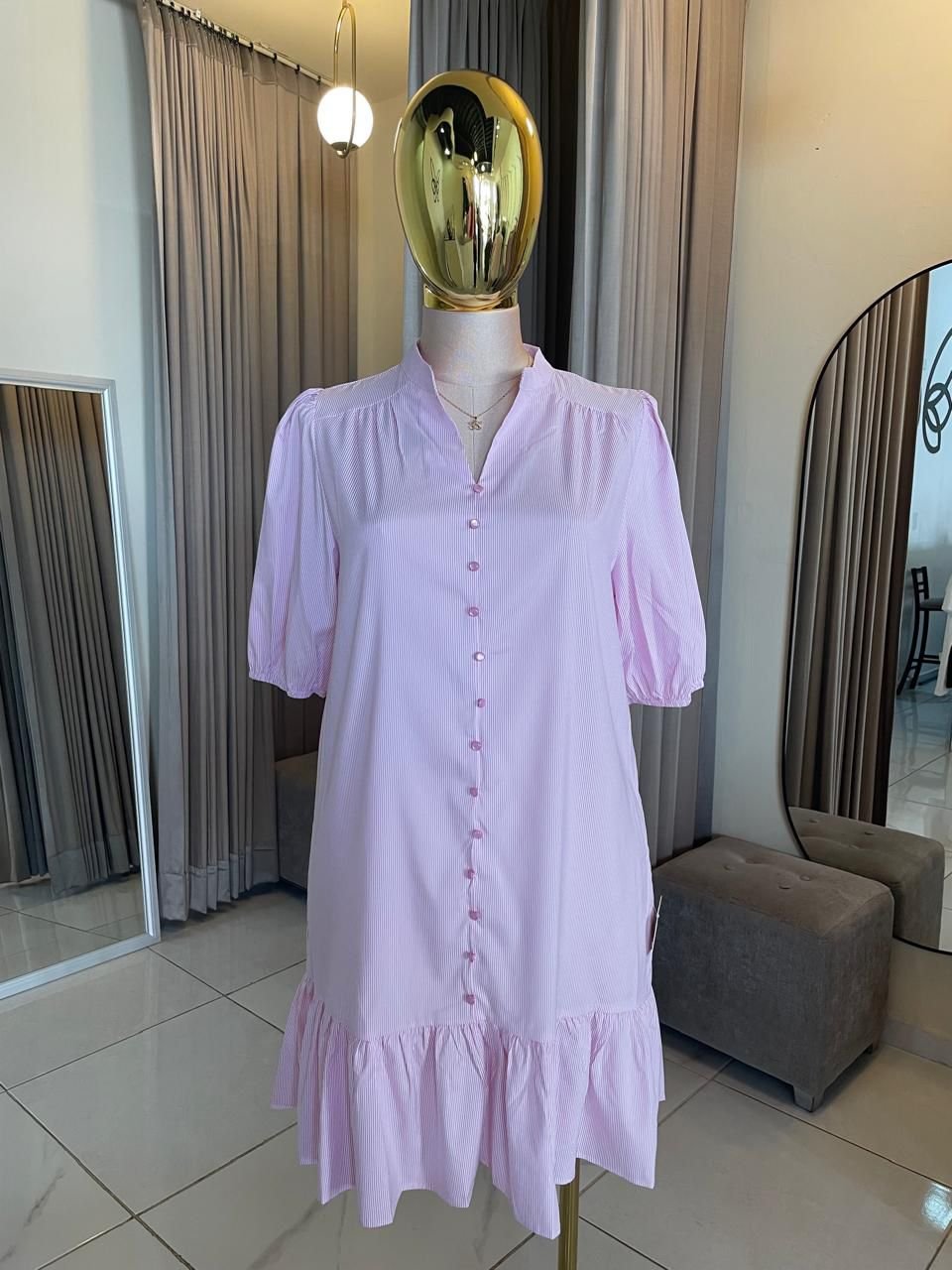 Vestido femenino y fresco en tono rosa con delicadas líneas verticales que estilizan la figura. Su diseño de manga corta ligeramente abullonada y escote en “V” con botonadura frontal aporta un toque romántico y elegante. El detalle de olan en la parte inferior le da movimiento y un estilo juvenil, perfecto para un look cómodo y chic.